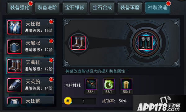 装备强化至100级后才可以进行神装改造,正如它的名字一样,神装改造的效果远远超过一般的装备强化。经过改造的装备能够提升角色总属性的百分比。没错!不是装备属性而是角色总属性的百分比。