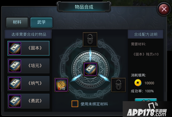 消耗武学残页及金钱合成武学秘籍。其他地方与材料合成一致。