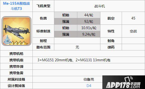 以副本中的小规模机队为例,因为机队交战时间短,只能保证机炮攻击一次,此时ME-155的面板伤害高达92,冠绝群雄,可以说是副本中第一好用的空优舰载机。