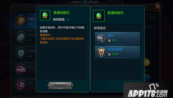 关于技能:消耗材料和金币,升级技能,每个技能,都有额外的2-3段新技能。材料获取途径,商会和竞技场商会,所以,要想技能升得快,竞技场别忘了哦~