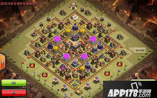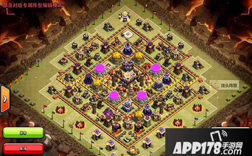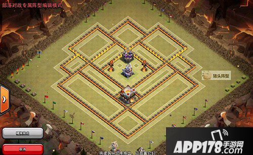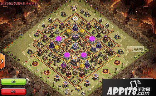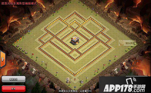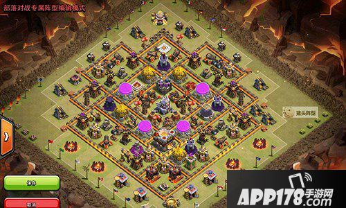 经典的猪头九本阵结构,大本内外置都可以,城堡靠中,采用格子分隔各种库和防御建筑,具有一定的引导作用。部战和Farm都可以灵活切换。当时也非常流 行,几乎每个部落的九本都在用。这次更新后,规则发生大的变化,大家都需要大本内置的阵,传统的猪头阵都可以用,设计的时候都考虑了大本内置的情况。