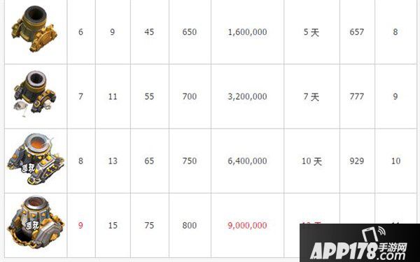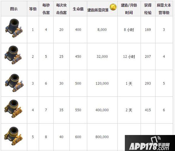 2. 迫击炮(Mortar)升级所需资源、时间及伤害提升等详细数据