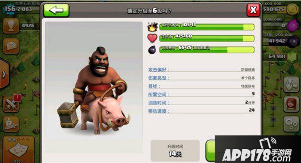 6级野猪:每秒伤害:118 生命值:535 建造所需资源:90 升级所需资源:10万黑 所需实验室等级:8级 所需大本营等级:10 升级所需时间: