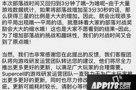 大家期待的部落冲突三月的大更新已经过去,此次带来的多项更新改进也是令人欣喜。例如新兵种巨石投手的带来,技能效果确实不错。不过在这更新调整中,也有些变化也是让人费解,比如部落战时间,从三分半钟再次调整为三分钟。这样打三星的机会就更少了,有玩家就这个问题问了官方,来看看官方是怎么回复的吧~