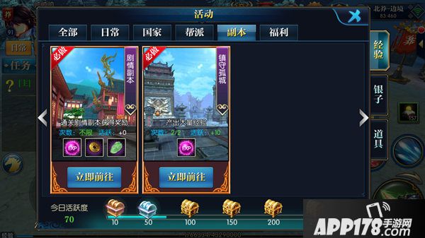 剧情副本就在活动界面,点击副本,经验,就能迅速筛选出来。
