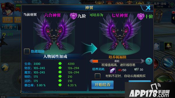 翅膀升阶需要消耗材料神羽,商城就有卖哦,并且价格相当便宜,只需要20银元宝就可以购买一个,购买了材料就可以进行进阶操作了,可以选择手动培养,也可以选择自动培养,要是材料不足,可以勾选自动购买选项。