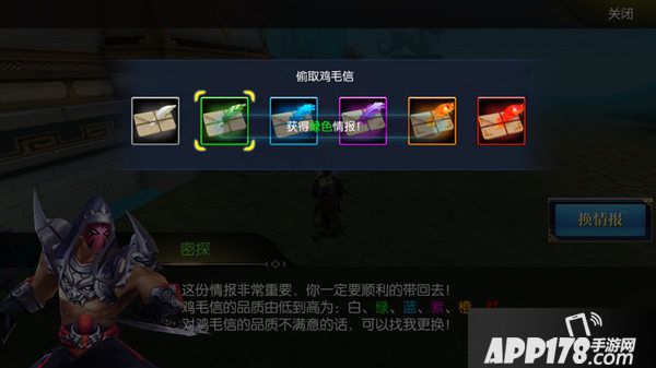 到达敌国探子后,就能拿到信件啦,信件按机密程度的不同分为几个档次,白色最次,红色最高哦,将军不满意低品质信件的话可以进行更换,10秒可以更换一次,将军切记不要被敌国将领发现,不然他们可不会手下留情。