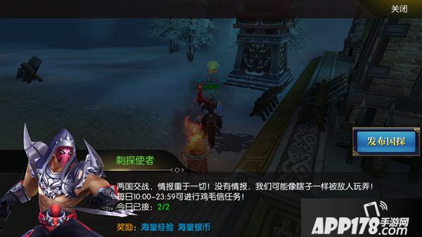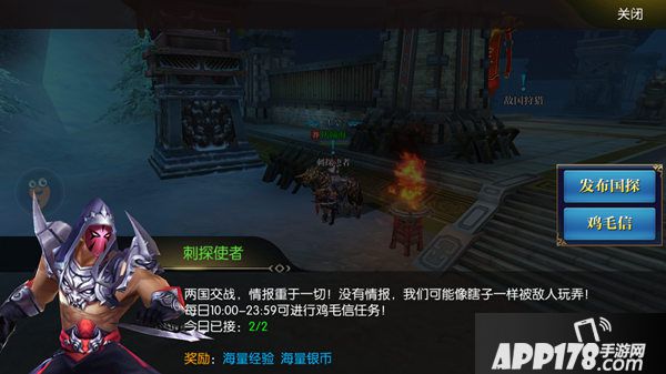 刺探任务在本国边境找到刺探使者接取,国家官员可以开启国探任务哦,国探活动持续一小时,每天可开启两次,期间所有奖励增加百分之50!