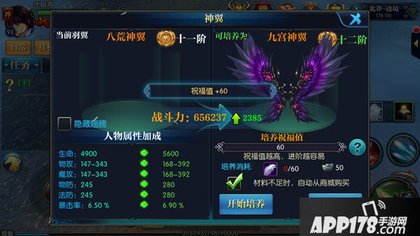 翅膀升阶需要消耗材料神羽,商城就有卖哦,并且价格相当便宜,只需要20银元宝就可以购买一个,购买了材料就可以进行进阶操作了,可以选择手动培养,也可以选择自动培养,要是材料不足,可以勾选自动购买选项。