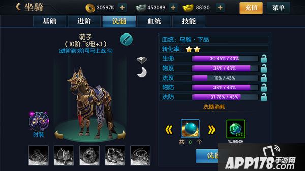 有了好血统,想要得到更多的属性加成,推荐使用洗髓系统,可以让将军宝马的更多属性直接加成给将军,洗髓可以获得更多的转换值,要是将军满意某个属性,可以使用洗髓锁将其锁住,该条属性就不会变化了。