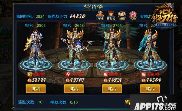在《北凉悍刀行》游戏中,一对一PK除了野外遭遇战之外,还有擂台争霸这个平台供你展现自己。每日你都有10次挑战更高排名的机会,想要更多的战斗机会需要通过金子进行购买。相应的每赢一场都会获得金子以及荣誉值的奖励,排名越高每日领取的奖励也就越高。荣誉值可以兑换荣誉商店中的道具,不只是宝石,甚至还可以刷出秘籍、翅膀材料等等非常珍贵的道具。