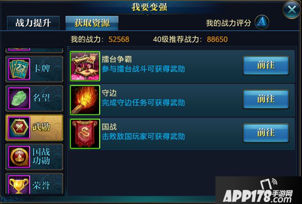 不同于文官,武值的提升是通过每日击杀敌国玩家、参加擂台争霸和参与国战获得武勋来升级了,当然