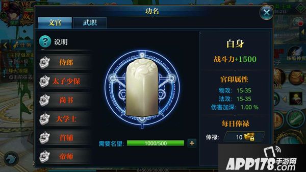 先来说说文官,是从白身直到帝师,中间还有十几个等级,每个等级官印都可以加战力和角色属性。
