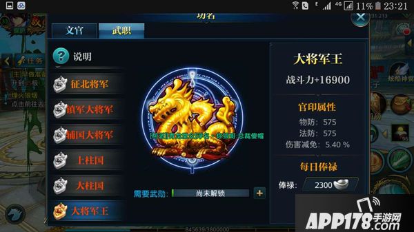 武官是从平民到大将军王,同样中间也还有十多个等级,每一级都有强力的属性加成和战力加成。