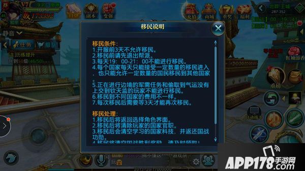 3.转国条件:开服前三天是不允许移民的,移民还需要先退出自己在本国加入的帮派,每天的19.00-