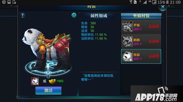 熊猫时装,属性加成,生命+300.物攻+30.法攻+30.物防转化11%.法防转化11%,非常可爱的一款,相信很多萌妹子都喜欢,可爱熊猫,阿竹同款,适合同样可爱的你,价格1980金子。