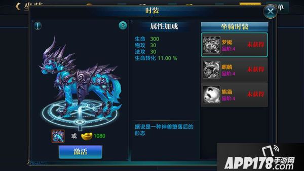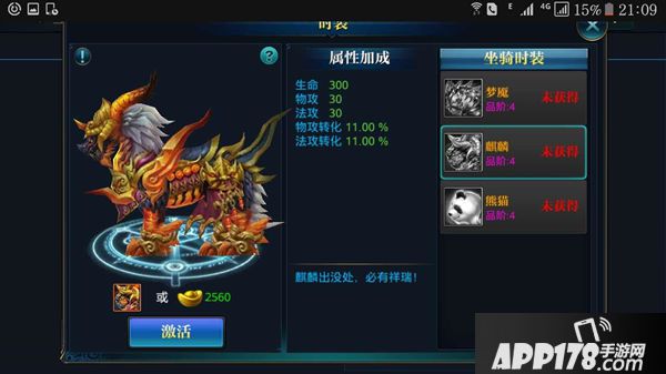 麒麟时装,属性加成,生命+300.物攻+30.法攻+30.物攻转化11%.法攻转化11%,麒麟时装威武霸气,胯下麒麟,千离厮杀,一站即达,价格2560金子。
