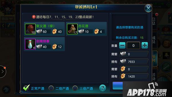 要战斗时获得强力buff吗,快来喝酒吧,每种酒效果都是十分钟,根据帮派几倍产酒会出现高品质美酒