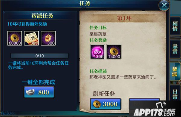 2.帮派任务:每日有十环帮派任务,做完之后获得大量经验和帮贡。推荐玩家可以通过少许银子一键直接完成十环任务,也可一环一环手动打怪完成。