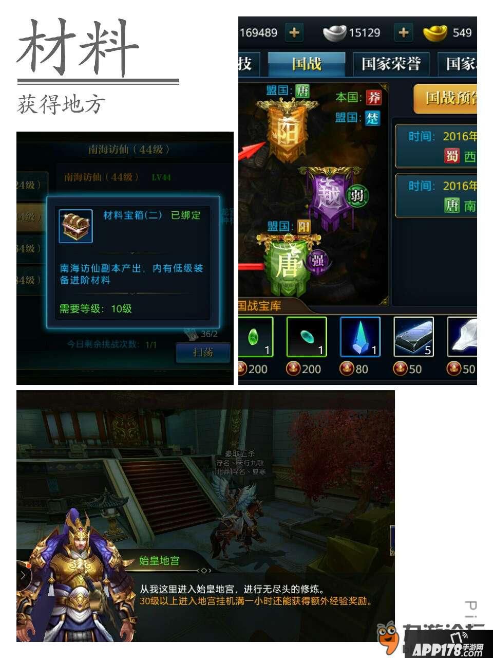 ②可以通过始皇地宫挂机获得,打怪随机获得各种一级材料。