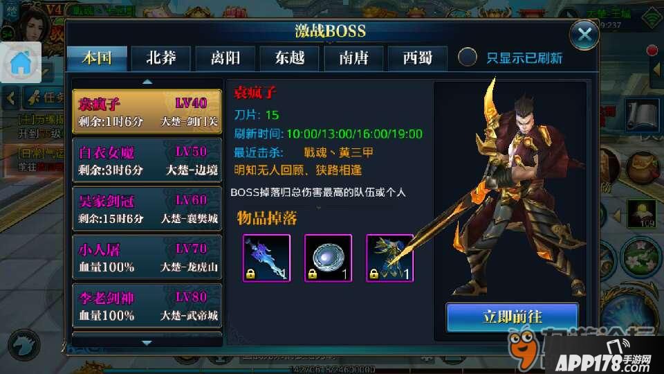 装备主要获取渠道还是打国家boss,可以爆蓝绿橙装备如果出了橙色这阶段装备都不用愁了,橙色多的话可以合成红色。40级之后可以看到boss页面,每天定时去打。运气不是很差一套橙很快。