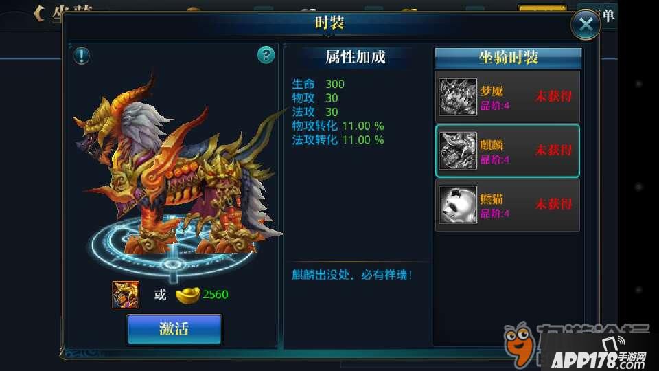 坐骑:坐骑战力的提升主要还是靠坐骑时装,55级的坐骑技能和60级以后的坐骑洗髓。时装的话第七天送梦魇,麒麟和熊猫就需要真金白银购买了。