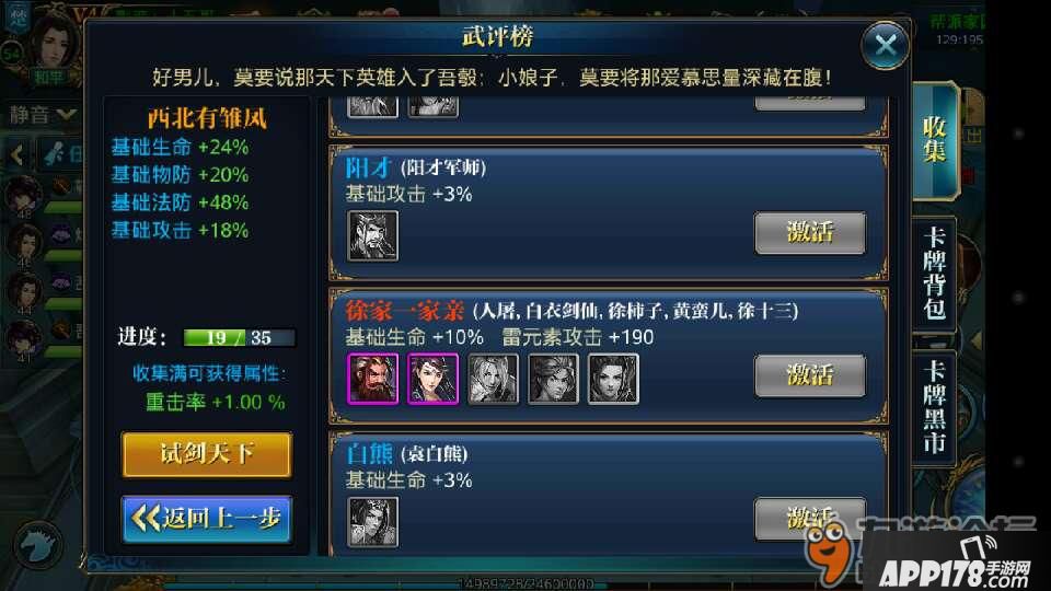 卡牌:卡牌可以通过试剑天下获得V6以上可以刷新,建议每次刷新到紫色以上在打。但是需要的金子多了就别刷新了~银子和金子充足的就去江湖游学获得。卡牌黑市有急需的可以购买