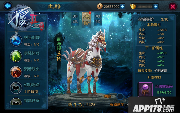 在坐骑达到10级之后将开启坐骑进阶功能,坐骑进阶所需要的材料为坐骑突破丹和铜币,坐骑会在进阶之后获取额外的大量属性加成,并且外观也会发生变化,同时开启其他的坐骑技能(每过10级可以进阶一次,每次的进阶外形都会产生变化,同时解锁更强大的坐骑技能)