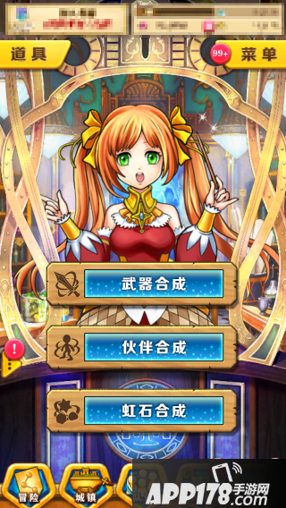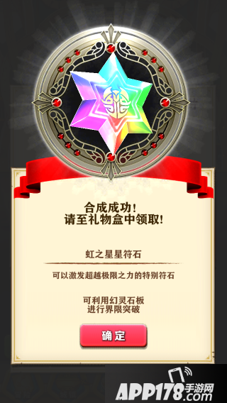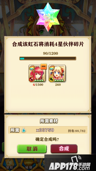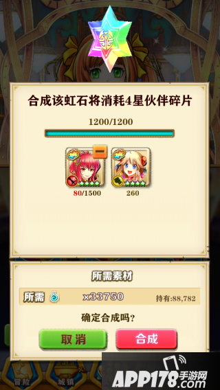 碎片界面中有三个选项:武器合成、伙伴合成、虹石合成。点击按钮,可进入各自的合成界面。