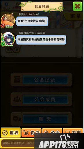 聊天一共有4个频道:世界、协力、公会、系统。如果想与互相关注的好友交流,需要通过菜单>好友>信息,然后与好友进行私聊。