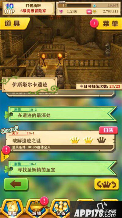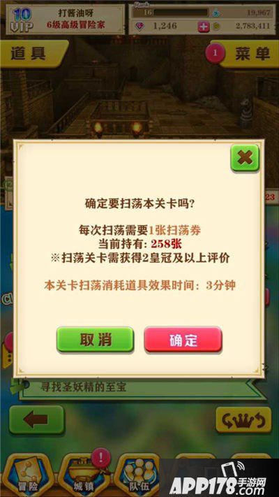 参与扫荡的方式也很简单。只要玩家在冒险副本过关后的星级评定达到了2皇冠以上(包括2皇冠),点击关卡界面每个关卡右上方粉红色的扫荡标识进入扫荡页面,随后玩家选择使用1张扫荡卷后即可开始扫荡。