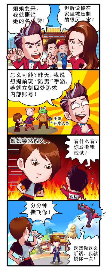 11月13日,由咪咕互娱代理发行,百度移动游戏和爱奇艺联合首发的“跑男”官方手游《奔跑吧兄弟3-撕名牌大战》即将上线,“跑男”粉丝提前开启疯狂“恶搞”模式,制作爆笑四格漫画,将娘娘拉入“撕名牌”战局,连超哥都要给跪啦!