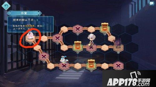 这个游戏的关卡都是从左到右的顺序,我们可以看到图中第一关分开了两条线,点击之后就可以看到条件提示:队伍中包含女性角色,前往2,上一点不入,必入3。这句话的意思就是说如果你的队伍中有女性的角色就会前往第二关,也就是图中上面那一关,如果没有女性就会去第三关,也就是图中下面那关,这等于是一个条件选择题,满足不同条件就会去往不同关卡。