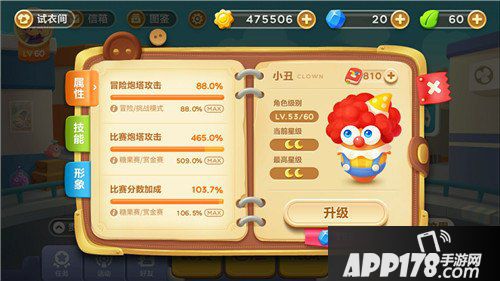 小丑为双月级角色,满级为60级,看到如此强大的小丑,各位波粉们是不是迫不及待的想要使用它啦!小丑的初次进阶为30级,由三星进阶至四星,需要50宝石和20个角色碎片,当然进阶之后的小丑不只是各项属性数据的大幅度增加,技能缤纷彩球也从最开始1500的伤害增加至1600,持续时间从5秒增加至6秒。游乐场主题炮塔额外攻击由15%增加至18%。进阶之后的小丑实力更加强劲,也更能为各位波粉们带来胜利哟!