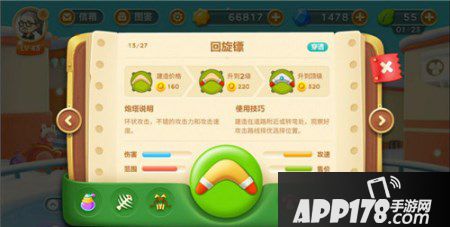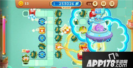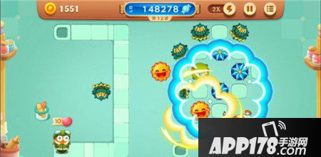 回旋镖的攻击方式就如同它的名字一样,发出的飞镖在攻击到怪物后会在攻击范围内旋转一个圆,再次回到炮塔中,因此在这个圆内的所有障碍物都会遭到回旋镖的攻击,在每条道路的转弯处安置回旋镖,就可以清除全图所有障碍物啦!还在为糖果赛密集的障碍物发愁吗?那就选择回旋镖吧!