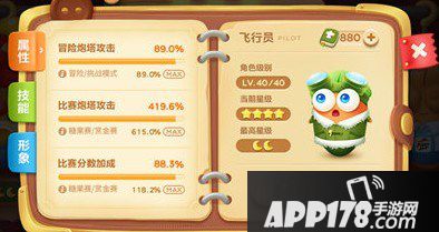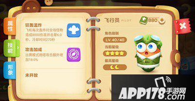 飞行员是和侦探一样是专为比赛而生的御用角色,为了能消灭掉比赛模式中层出不穷的各色怪兽,它天生就拥有强大无比的炮塔加成能力!别看它专为比赛模式而生,但高达89.0%的冒险模式炮塔攻击加成,即使碰到游乐场的怪兽也丝毫不弱哦!在比赛模式中则更是专业性凸显,最高615%的炮塔加成能力,能让萝卜丝们轻轻松松跑入50波!高达118.2%的比赛分数加成更是让它在所有角色中独占鳌头,风头一时无俩!