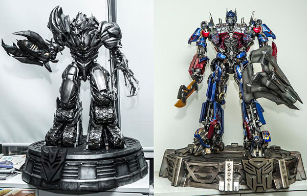这两款模型分别是博派与狂派的领袖擎天柱和威震天,光从图片便不难看出,这两台模型造价绝对不菲。擎天柱的这款模型全高将近70CM,由模型本身和原型底座共同组合而成。模型在造型和色彩上完美还原了电影中擎天柱的霸气形态,而其精致入微的细节刻画也堪称完美。略带斑驳的金属质感外壳看起来仿佛刚刚经历过一场惨烈的战斗归来,尽显王者之气。同时其双眼以及身前腰部两侧还配备有特制的发光LED,为其增添了不少收藏价值。