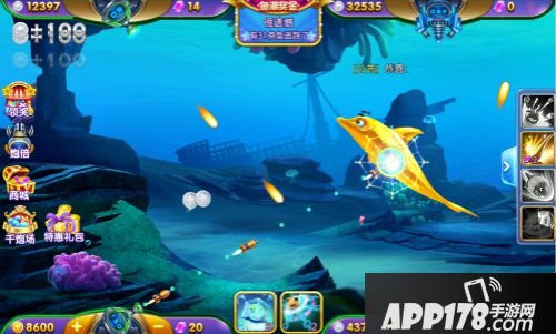 第二个是神灯技能,使用之后会出现神灯释放一条彩金鱼,使用该技能的玩家在捕捉这条彩金鱼的时候会变得十分容易,简单地说就是用技能给自己换来一条彩金鱼,但是彩金鱼的种类是随机的,所以施放技能后到底能获得多少金币就要全凭运气啦。