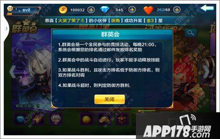 群英会:是一个全民参与的竞技活动,每晚21:00系统会根据你的排名通过邮件发放奖励(全都是是钻石,所以拿到一个好名次很重要。)