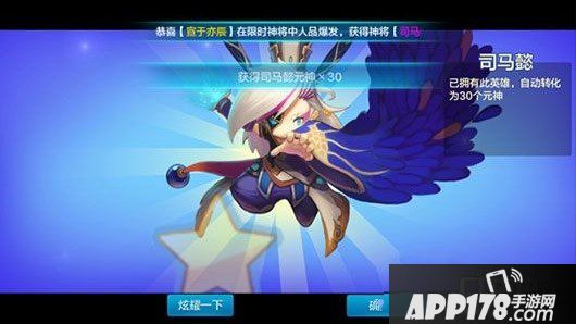 活动期间,主公可以花费260钻石进行一次拜神将,可随机获得活动神将——司马懿、热点英雄、热点英雄元神及其他奖励物品,连续拜十次必得一个英雄。主公们最好洗洗脸再来拜神将,能不能拜出神将主要就看脸啦。