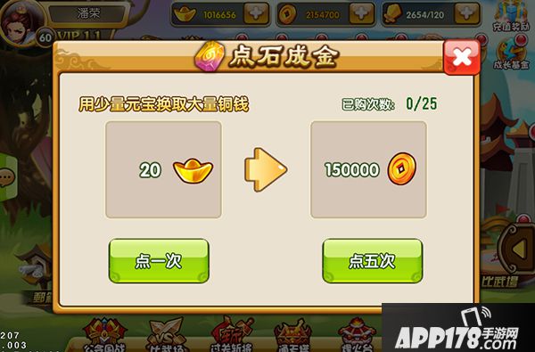 用少量元宝换取大量铜钱,小编没钱的时候,第一个想到的就是使用这个点石成金,花费20元宝就有15W的铜钱,可以缓解给武将升级技能装备时铜钱不够用的尴尬。