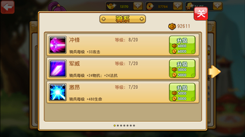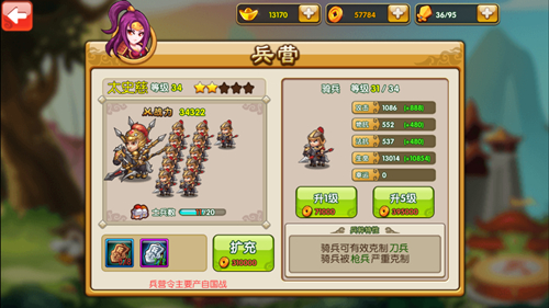武将可以使用兵营令招兵买马,每增加一名士兵,武将战力随之增高,增加人数越多所需兵营令随之增加。玩家可以使用铜钱为士兵提升等级,增加士兵整体属性,士兵也需要健硕的体魄才能跟着武将上阵杀敌。保家卫国责无旁贷,当玩家积累的足够的功勋时可对士兵科技进行提升,增加士兵的杀伤力。