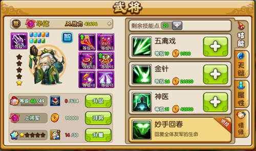 《曹操别跑ol》里华佗是一名非常称职的辅助,所有技能都是为了队友而设,可以说是上阵杀敌的必备武将。神医华佗激发被动技能可提升48.4%治疗效果,同时初级技能“五禽戏”也可提升本行全体将领生命上限,效果持续到战斗结束。不仅仅如此,华佗还可以远程支持,“金针”技能可回复最远友军将领生命,就算骑着马的骑兵先跑了,也不怕没有身后的支援。当然能在《曹操别跑ol》中被称为神一般的辅助,不仅仅只是如此,华佗更是能“妙手回春”持续回复全体友军的生命,带着华佗上战场就如同多了好几名的武将上阵。
