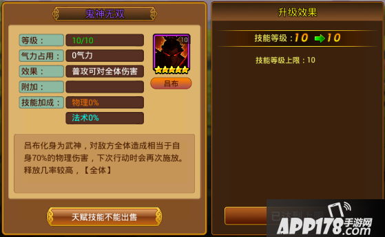 天赋技能描述为:吕布化身武神,对敌方全体造成相当于自身(最高70%)的物理伤害,下次行动时会再次施放。释放几率较高。【全体】