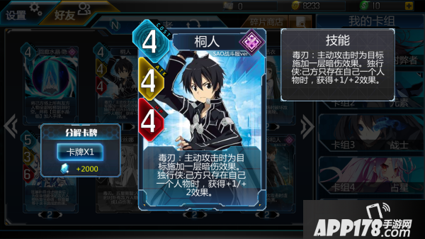 技能描述:毒刃:主动攻击时为目标施加一层暗伤效果;独行侠:己方只存在自己一个人物时,获得+1/+2效果。