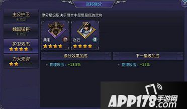 3、护卫双杰:玩家同时招募到典韦、赵云,激活该缘分。缘分属性:按照百分比增加物理攻击