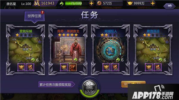 每天可完成的世界任务没有限定次数,但每完成一次需要消耗6点“耐力”。“耐力”满格为100,每小时回复10点。