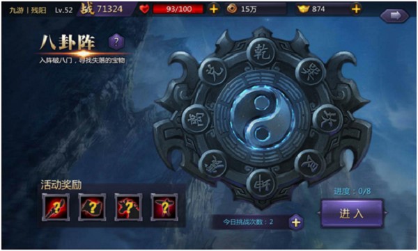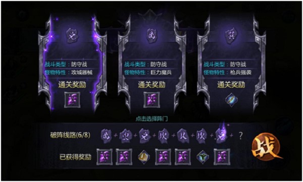 入我八卦阵,破我阵八门,事了拂衣去,深藏功与名。玩家进入八卦阵后,系统即随机开启某个阵门,每个阵门上都有不同的兵种,胜利后开启下一个阵门,连续战胜8个阵门后即可挑战敌军守将,战胜敌军守将可获得最终宝物。