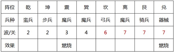 在6-8波的关卡(即第5关及以后的关卡)中,玩家要千万注意,此时怪物会附带有燃烧BUFF,建议避开妖术、联合、器械等驻守的阵位,这样破阵会相对轻松许多。