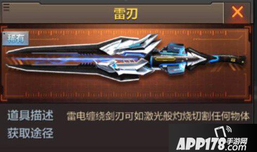 获取途径:目前官方还没有注明到底是从哪些突击能够获得,小编猜着,雷刃应该是龙啸一样,属于非卖品。那么就只能刷任务或者刷挑战了。